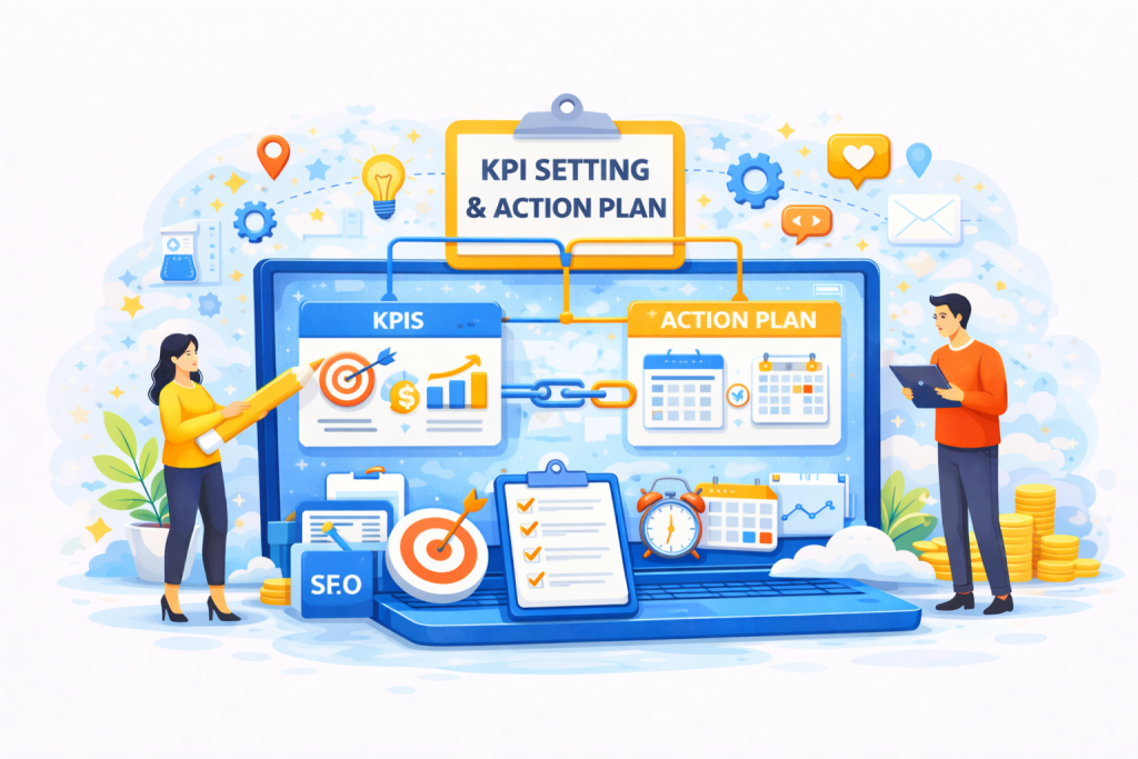• معیارهای کلیدی عملکرد (KPI) مثل رتبه، ترافیک، نرخ تبدیل تعیین می‌شود